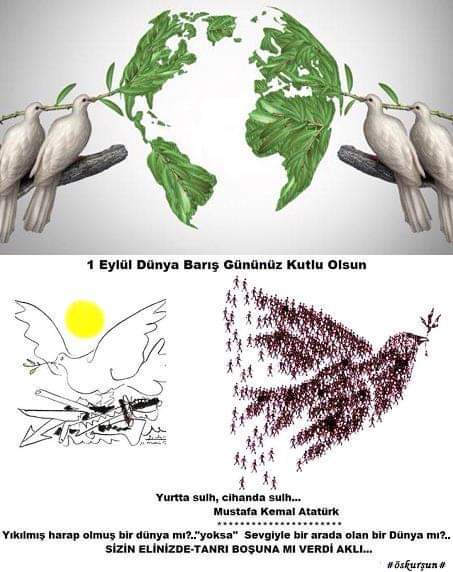 Ne yeşil bir zeytin dalı gibi baharlık ne de bir güvercin kanadı gibi hafiftir barış, bir bebeğin gülüşü gibi aydınlık aşk kadar güçlüdür barış. Irk, din, dil, fikir, zevk ve sınıf farklılıklarımızın gerçek zenginliğimiz olduğunu unutmadan saygı, sevgi, anlayış ve hoşgörü içinde 1 Eylül Dünya Barış Günü Kutlu olsun…