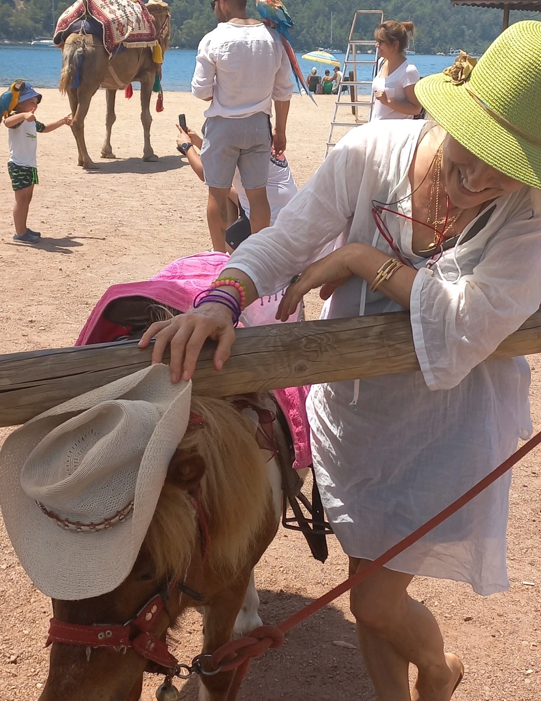 Tur yapan jeeplerle sık sık kalabalıklaşıyor. Boyları hiçbir zaman 1,47 cm’yi geçmeyen, bol püsküllü, bodur Mididlli atına binen çocuklar, deniz kıyısında birkaç tur atıyor. Bir de emektar deve var ki gelene gidene dişlerini göstererek