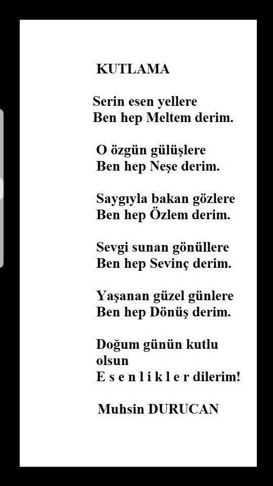 Sevgili dostum Muhsin Durucan öğretmenim: Doğum günün kutlu olsun.. Esenlik, esinlik, erinç-gönenç içinde uzun bir ömürle umduğun geleceklere ulaşmanı diler; seni, sevgi ve saygılarımla selamlarım.”