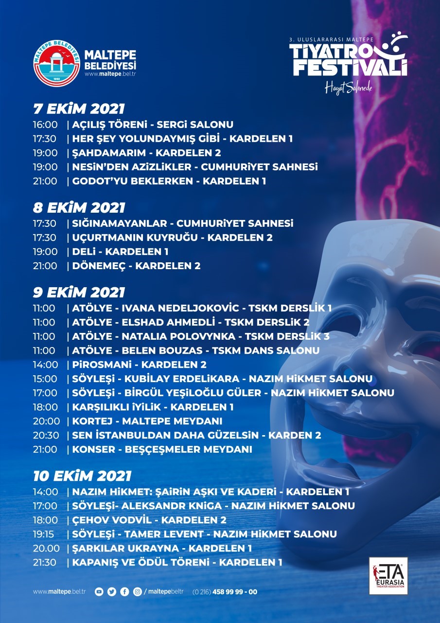 Takvime göre 14 yerli ve yabancı yapıtın yer alacağı oyun, konser, söyleşi ve atölyelerle renkli etkinliklerin düzenleneceği festivalde Özbekistan, Sırbistan, Azerbaycan, Ukrayna, İspanya, Gürcistan, Kuzey Kıbrıs Türk Cumhuriyeti ve Güney Kıbrıs Rum Yönetimi ile Rusya Federasyonu’ndan tiyatro grupları sahne alacaklar. Oyunları yasaklanan Türk tiyatrosuna kalitesiyle emek veren Genco Erkal da Türk şiirinin unutulmaz adı Ahmed Arif’in ölümünün 30. yılı anısına  “Şahdamarım” adlı oyunla sahnede…