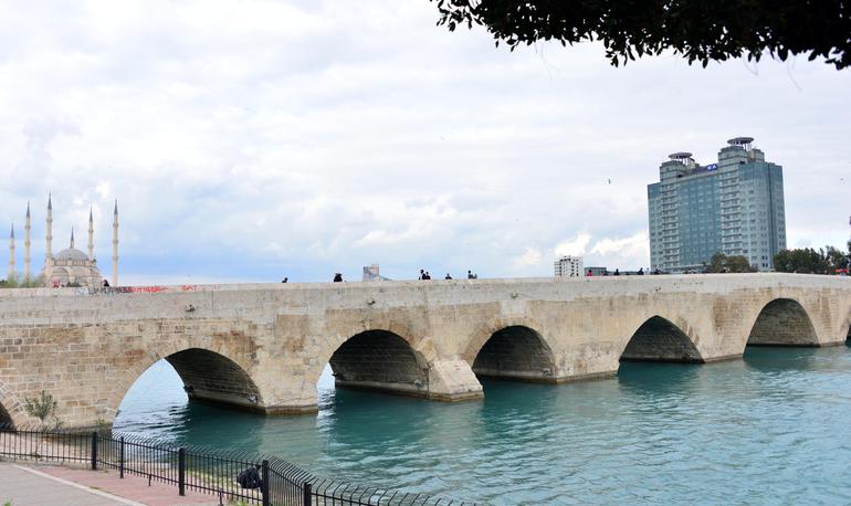 yedisi toprak altında kalmış. Şu anda on dört gözlü olan köprümüz 310 metre uzunluğundadır. Roma İmparatoru Hadrian tarafından yaptırılan köprü Jüstinianus tarafından ciddi anlamda onarılmıştır. Osmanlı döneminde de birkaç kez onarılan köprü, şu anda kullanılmakta olan dünyanın en eski köprüsüdür. İlkler ve enler kenti Adana’da yaşamaktan çok mutlu oluyorum ve Romalıların yaptığı ve kullandığı köprüyü asırlar sonrası kullanmak haz veriyor bana… Bu köprü Seyhan ilçemizle Yüreğir ilçemizi bağlamakta… Biz Yüreğir’deki güzellikleri ve Karşıyaka’daki muhteşem otelleri Hilton’u uzaktan seyrederek tarihi yerlerdeki gezimizin tadını çıkarıyoruz.
