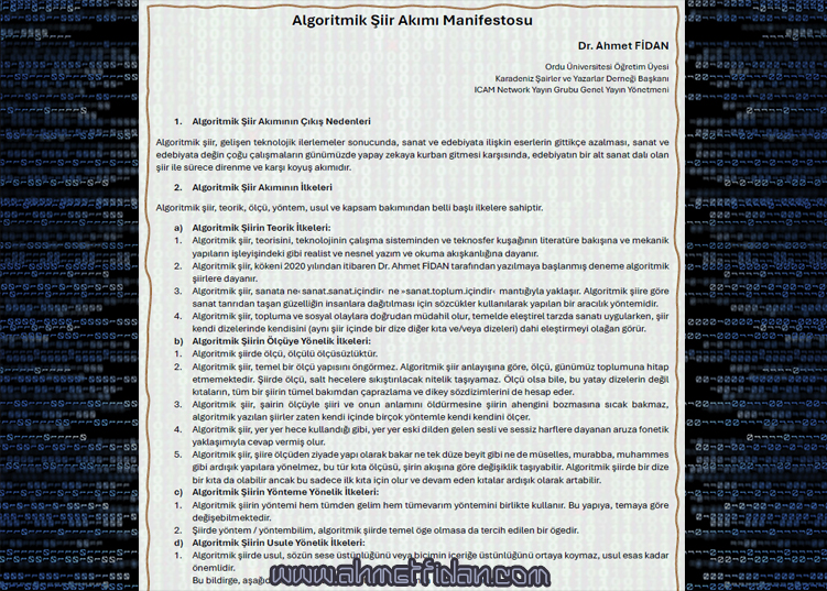- Algoritmik şiir, kökeni 2020 yılından itibaren Dr. Ahmet FİDAN tarafından yazılmaya başlanmış deneme algoritmik şiirlere dayanır.