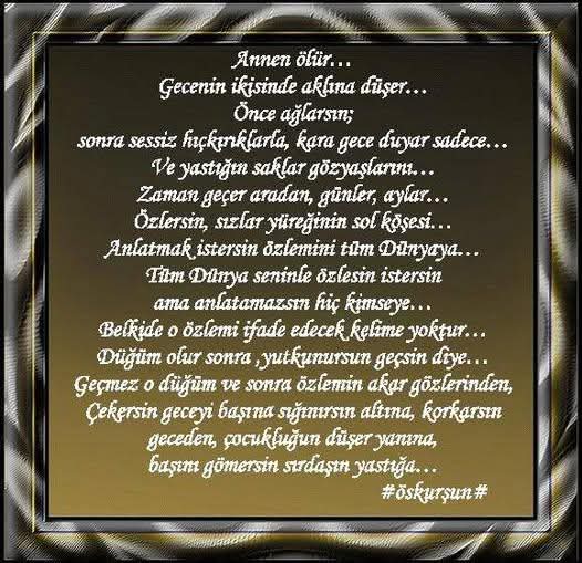 Hiçbir zaman kin, haset, kıskançlık bulundurmazken her zaman daha iyiye ulaşmamızı sağlar. Umutsuzluğun en koyu zamanlarında dahi hemen anneye koşarak yaralarımızı sarmasını bekleriz. Anne hakkının ödenmeyeceğini unutmamalıyız… Anasız ev ıssız geceye benzer. Gecenin bir vakti anne diye uyanırsın ama yoktur, anlarsın anasız kaldığını, başını tekrar yastığa gömersin gece görmesin diye gözyaşını…