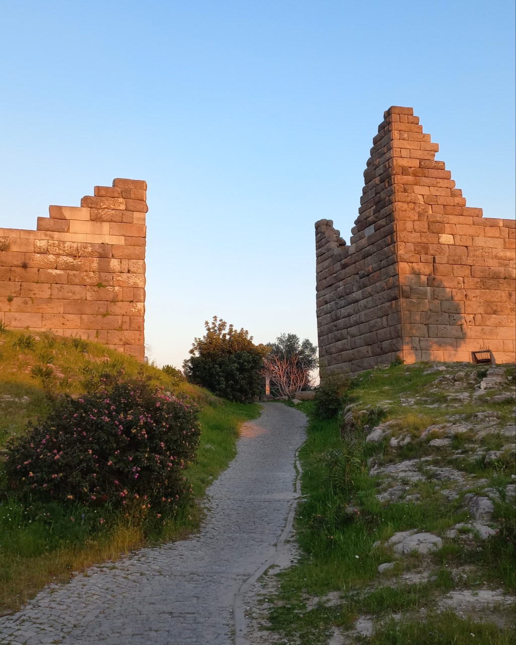 Gün batımına yakın evden çıktım, rota çizmeden yürümeye başladım.” Yüreğim nereye götürürse.” dedim. Kendimi Myndos Kapısı’nda buldum. Gün ışığı ile binlerce yıldır dostluğunu sürdüren, gökyüzüne bakış atan, toprak ile beslenen bu heybetli tarihi alanda büyülendim. Birkaç fotoğrafa, kalıntıların arasında bulunan renkli papatyalar eşlik ediyordu.