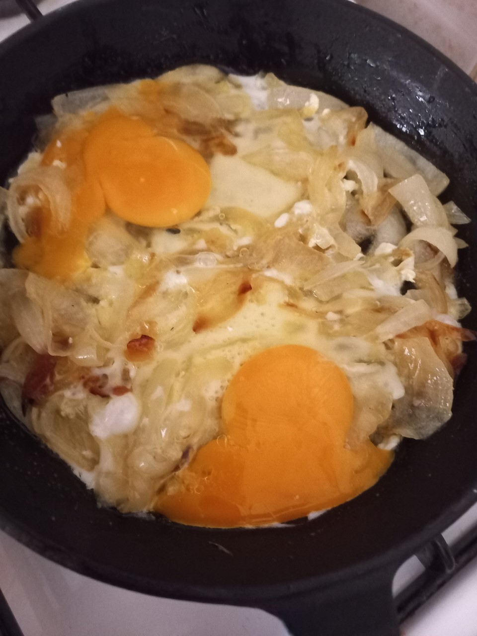 4 adet soğanı sövüşlük olarak doğrayın. Tavaya biraz tereyağı, biraz sıvıyağ koyup oldukça kısık ateşte ara sıra karıştırarak karameliz olana kadar pişirin. (en uzun sürede pişen en makbul olanı, iki saat gibi…) Soğan istenilen kıvama gelince tuz ve baharatlarını katın. Kavrulan soğanın üzerinde boşluklar açarak yumurtaları kırın. Yumurtaların pişmesi için de birkaç dakika bekleyin. Ocaktan alıp servis yapabilirisiniz. Arzuya göre sucuk veya pastırma katabilirsiniz. Afiyet olsun. Sabırla denedim.