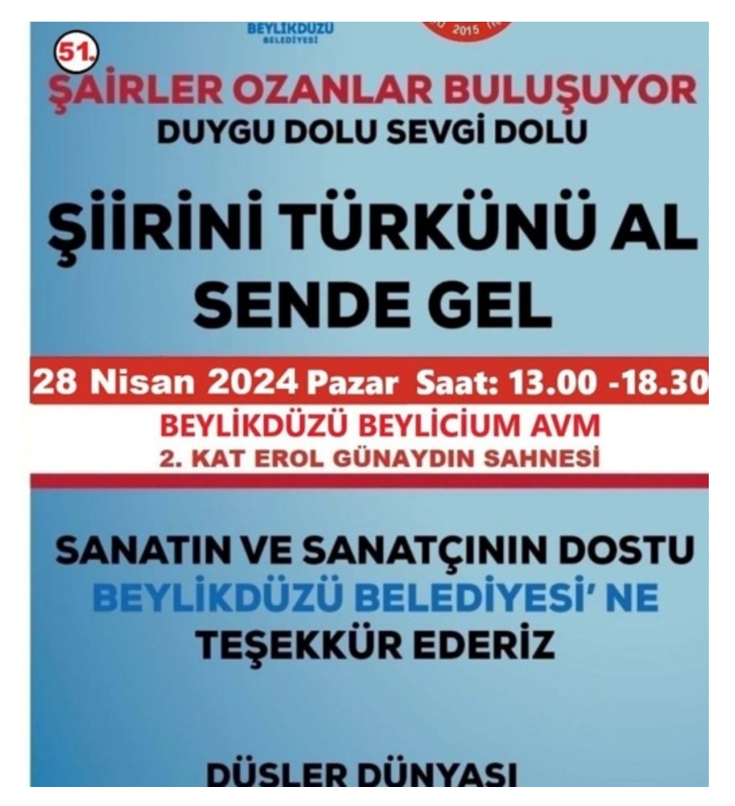 Etkinlikte katılımcılar genellikle kendi eserlerini seslendirdiler. 23 Nisan Ulusal Egemenlik, M. K. Atatürk ve Kütüphaneler ve kitap temalı şiirlerinin okunduğu etkinlikte Düşler Dünyası Kültür Sanat Topluluğu Başkanı Halk Şairi İsmail Aydoğmuş: “Etkinliğimize ev sahipliği yapan, sanatın ve sanatçının dostu Beylikdüzü Belediye Başkanına, görevlilerine ve emeği geçenlere teşekkür ederiz.” derken, katılanlara da “Hoş geldiniz!” söyleminde bulundu.