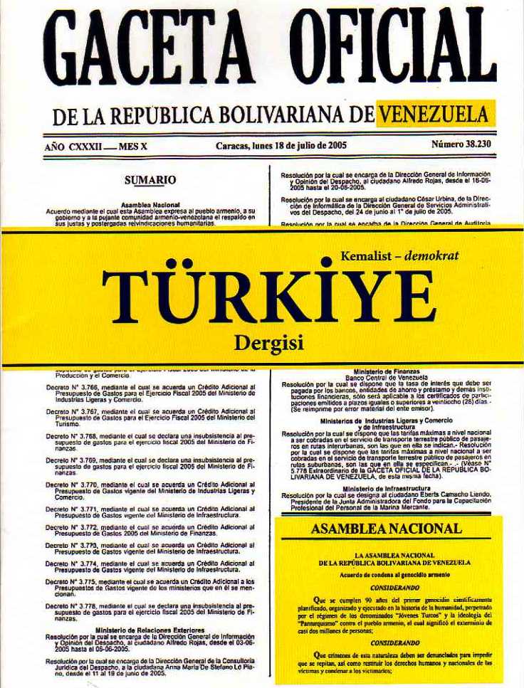 1. 14 Temmuz 2005 tarihinde, bu günkü Başkan Nicolas Maduro Moros’un Başkanı olduğu Venezuela Cumhuriyeti Milli Meclisi tarafından alınan karar; “Üstelik aynı müfteri menfur devlet tarafından 1992 Hocalı/Karabağ soykırımları daha yenice işlenmiş iken” Tam bir gaflet, dalâlet ve cehalet sonucudur. Medeni bir hukuk devleti olmakla asla bağdaşmayacak biçimde utanç verici yalan, aleni sahtekârlık ve bariz bir iftiraya onay vermek; En az, fiilen soykırım yapmak kadar ağır, affedilmez bir suçtur. Kaldı ki, bu mesnetsiz iddia, iftira, kin-kir ve intikam amaçlı yalanlar, yıllar önce tarih bilginleri, akademisyen ve hukuk otoriteleri tarafından ispatlanmış ve Şerefli Türk Milletinin kesinlikle soykırım yapmadığı, ancak Taşnak ve Hınçak çetelerinin defalarca soykırımına maruz kaldığı kanıtlanmıştır. Mezkür kanıt, ispat ve görgü şahitleri ile “meşru ve yasal zorunlu göç” olayının taraf ve muhataplarına ait ifadelere ilişkin çok güçlü belgeler, bilgiler ve karineler Mehmet Arif Demirer’in iş bu dergisi dahil olmak üzere; Bütün dünyaya açık arşivlerde sarahaten yer almaktadır.