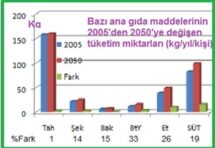 Söz konusu çizelgedeki tahmin değerlerine ulaşmak için kullanılan parametrelerin başında, kişi başına yıllık kilokalori gelmektedir. 2005 ortalama değer 2772 kilokalorinin 2050’lerde 3070’e çıkacağı tahminlendiğine göre, biz genelde, artan nüfusun yanında, her bir şahıs için %10 daha fazla gıda maddesi üretmek zorundayız. Bu aşamada hangi gıda kategorisinde, nasıl bir değişim olacağının belirlenmesi birçok sektör sorumlularına yol gösterecektir. Grafikteki ilk sütunda yer alan tahıllarda, sanki yıllık kişi başına tüketimde bir değişiklik olmayacakmış gibi bir izlenim vermektedir. Ne var ki, buğday, mısır, pirincin yer aldığı bu kategoride çarpıcı geçişler beklenmelidir. Nitekim Türkiye’de de kentleşmeden de kaynaklanan nedenle, yıllık kişi başına pirinç tüketiminin son 30 yılda iki misline çıkmıştır[2]. Yine Çin’de, artan gelir nedeniyle tüketici buğdaydan pirince yönelmiştir.