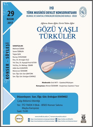 Evet, 29 Kasım 2017 günü “Gözü Yaşlı Türküler” izlencesinde olmak için belirlenen konser salonuna girip kendime bir yer buldum. Gazeteci Araştırmacı Yazar Ahmet Özdemir ile Gazeteci Folklorcu Erol Aktı, yönetim masasında… Saz ekibi karşımızda…