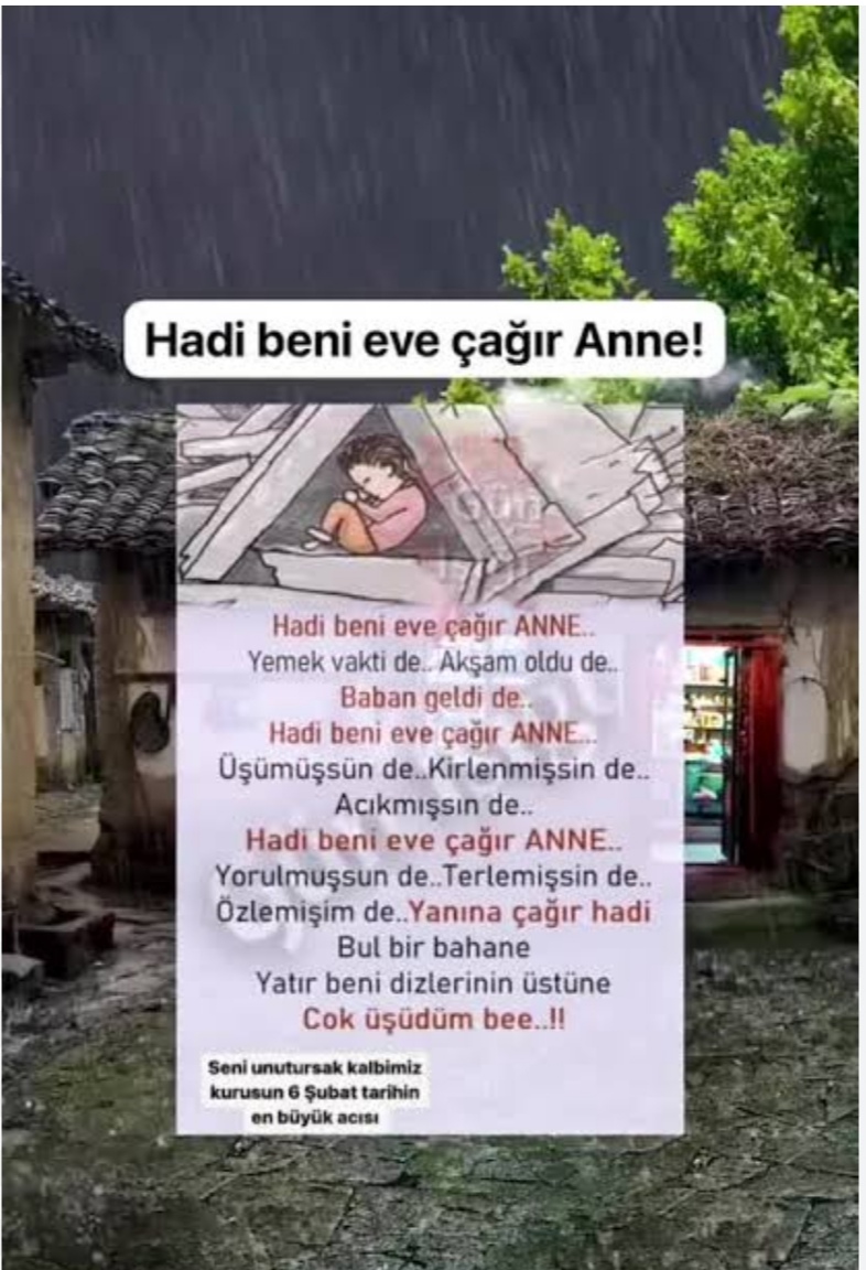 Annem başımızdaki betonu kaldırsanız, kendimizi dışarıda sayarız. Böylece kızıma ve babasına da ulaşırım. Annem göz yaşlarım kurudu. Hiç mi yardıma gelen yok. Bina çöktü mü yoksa yan mı yattı. Bağır çağır başımızdaki betonu kaldır.