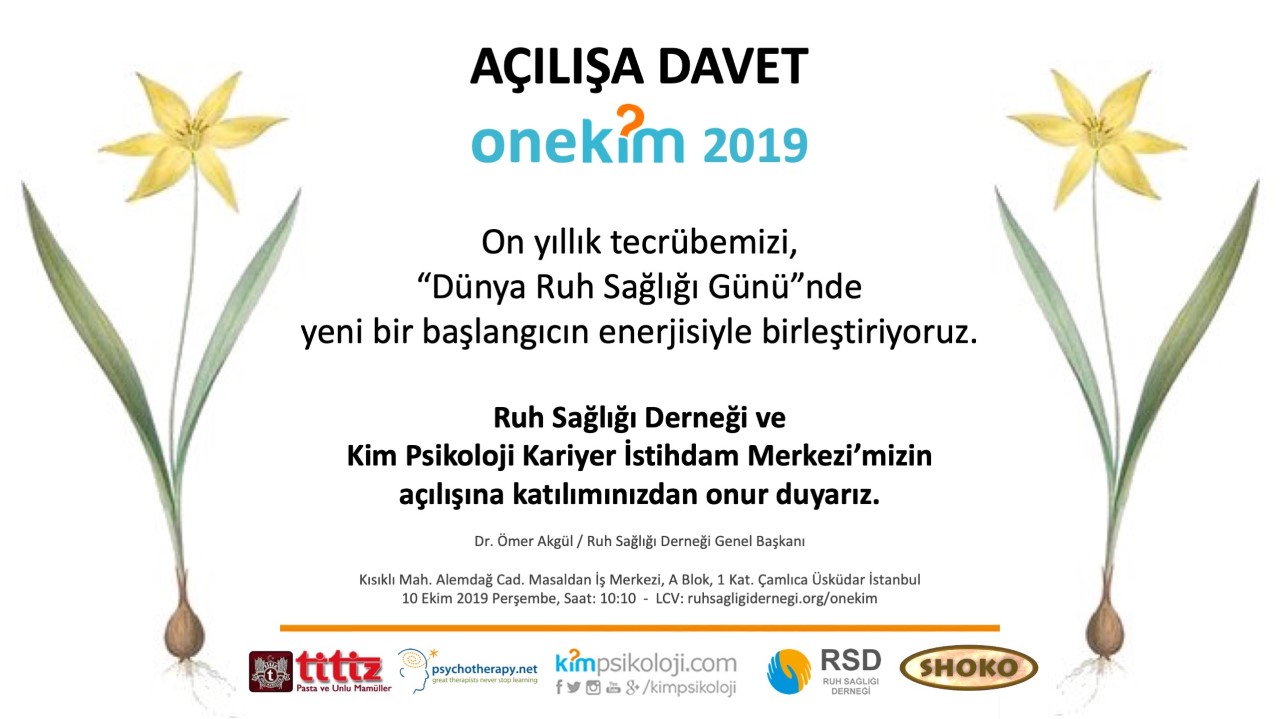 10 Ekim tarihinde saat 10:10da Ruh Sağlığı Derneğimizin ve Kim Psikolojimizin yeni ofis açılışları gerçekleşecektir. Tebrik ziyaretleri, açılış ve gün boyu ücretsiz etkinliklerimiz tekne turu programına kadar yeni ofisimizde devam edecektir.