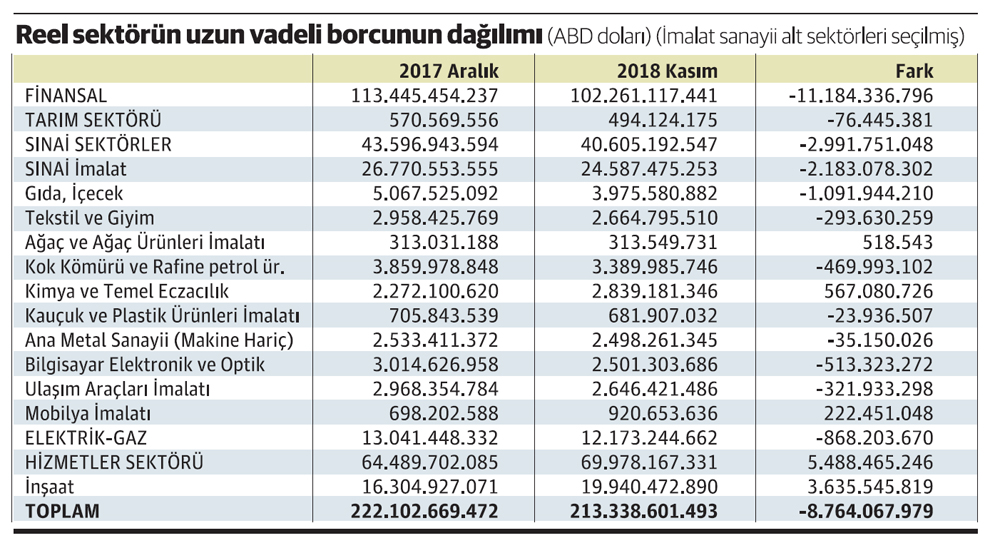 İmalat sanayii sektörlerinin 3 sektör dışında tamamının uzun vadeli borçlarının son bir yıl içinde azalması (net borç ödeyici olmaları) dikkat çekti. İmalat sanayii içinde uzun vadede son 11 aylık dönemde en yüksek net borç ödeyicisi konumda olan sektör 1 milyar 91 milyon dolar ile gıda sektörü oldu. Uzun vadeli finansman sağlayabilen imalat sanayii sektörü ise 567 milyon dolar ile kimya, 222.4 milyon dolar ile mobilya ve 518 bin dolar ile ağaç ürünleri oldu.