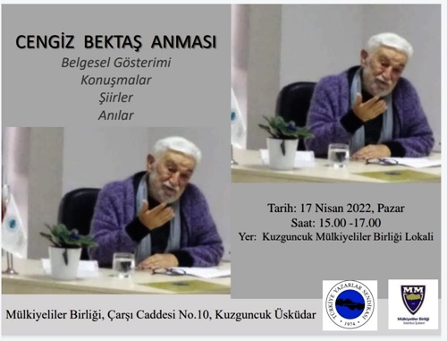 gerçekleşecek olan ‘Cengiz Bektaş’ı Anma’ etkinliğimiz, Belgesel Gösterimi ile başlayacak. Türkiye Yazarlar Sendikası (TYS) Genel Başkanı Adnan Özyalçıner, Cengiz Bektaş ile olan 75 yıllık dostluğunu anlatacak… Etkinlikte; Cengiz Bektaş’ın ailesi adına bir konuşma yapılacak, sonrasında onun şiiri, denemeleri, yazarlığı, mimarlığı üzerine konuşmalar yapılacaktır.”
