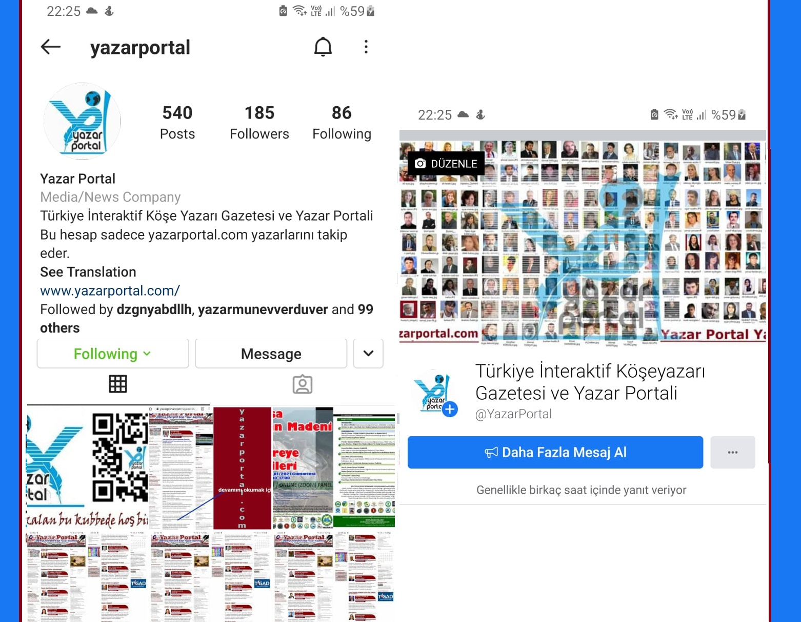Yazar Portal sosyal medya hesaplarına sahip çıkın. Gerek facebook sayfamız gerekse instagram sayfamızı abonelerimizin, okurlarımızın, yazarlarımızın beğenmelerini ve sık kullanılanlara eklemelerini bekliyoruz.