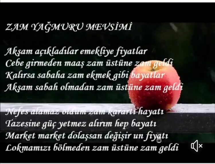 – Yapılır zamlar, yağmur misali damlar, altın maltın kalmadı, gitti çeyrekler, tamlar. Yılbaşında kesilir çamlar, açgözlü yamyamlar, doymak bilmez adamlar, halimizden kim anlar?